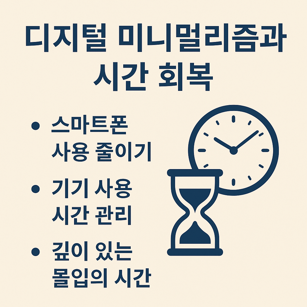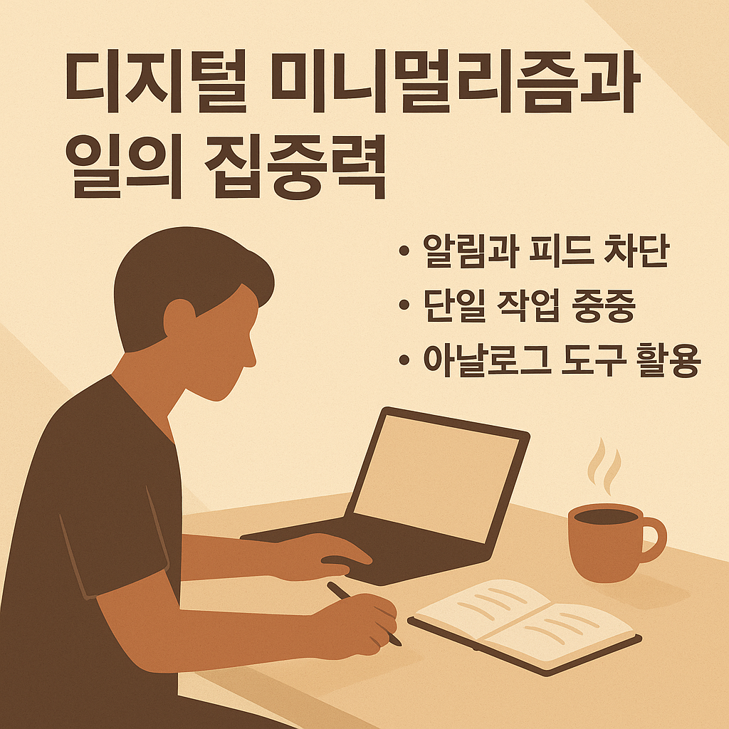“일 잘하는 사람은 기술을 잘 쓰는 사람이 아니라, 기술의 흐름에 휩쓸리지 않는 사람이다.”현대의 일은 점점 더 빠르고 복잡해지고 있다.회의, 메신저, 이메일, 알림…하루 종일 일했는데도 ‘하나도 끝내지 못한 기분’이 든다면,그건 당신의 능력이 아니라 환경의 문제다.디지털 미니멀리즘은 이 분산된 환경에서‘한 번에 하나의 일에 몰입하는 법’을 되찾게 해준다. 1. 집중을 빼앗는 건 일의 양이 아니다많은 사람이 “일이 많아서 집중이 안 된다”고 말한다.하지만 진짜 문제는 ‘중간에 깨지는 흐름’이다.한 번 집중이 끊기면, 다시 몰입하는 데 평균 23분 15초가 걸린다.디지털 알림 하나가, 하루를 파괴한다.💡 점검 방법업무 시간 동안 열어두는 앱·창 개수 세기하루 알림 횟수 파악 (스마트폰 ‘스크린타임’ 활용..